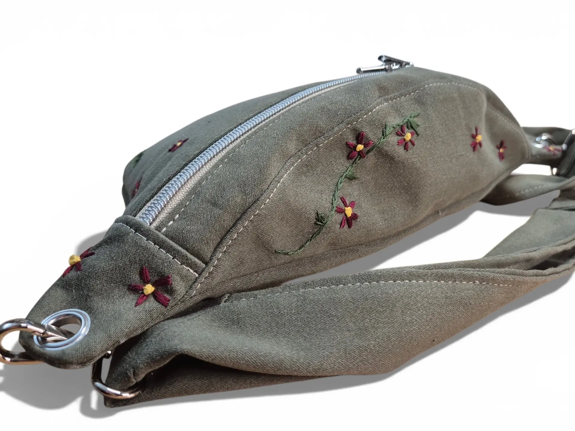Autant d’histoires et de textures qui se transforment en accessoires uniques et durables. Les sangles, elles aussi issues de la récupération, sont fixées au sac par le biais d’œillets métalliques ! Un détail à la fois esthétique et solide, qui apporte une touche d’originalité à chaque modèle.